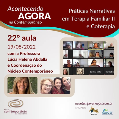 22° aula do Curso de Formação Esta acontecendo agora a 22° aula do Curso de Formação em Terapia Familiar Sistêmica Contemporânea!Hoje falamos sobre Práticas NarrativasLeia mais »